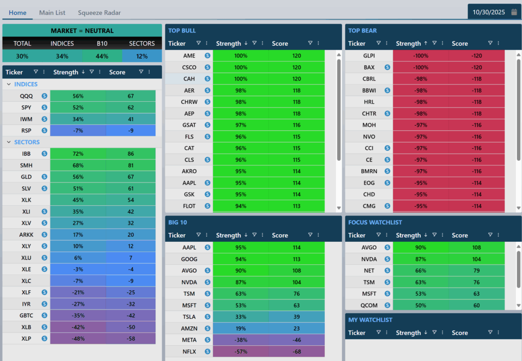 The market closed the day pretty neutral overall, with mixed signals across the board. The indices were slightly green — QQQ up 56%, SPY holding 52%, and small caps (IWM) lagging behind at 34%.