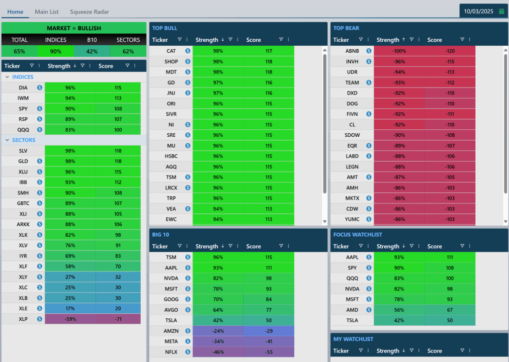 Bulls are loaded with names like CAT, SHOP, MDT, and GD all pushing 97–98% strength, while the bears have some big losers like ABNB (-100%), TEAM (-93%), and INVH (-96%).